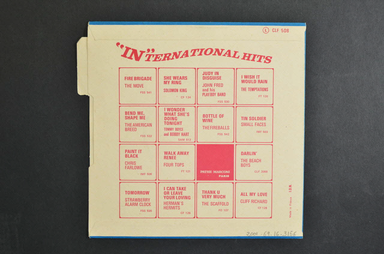 Cette pochette en papier, pliée et collée, est de format carré. Une petite languette blanche contenant des inscriptions rouges se trouve dans le haut de la bordure droite.