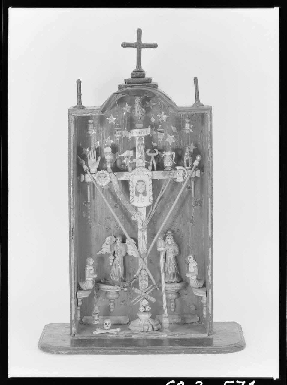 photographie, Croix en bois polychrome, accompagnée des attributs de la Passion. Sous verre