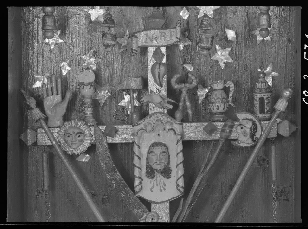 photographie, Croix en bois polychrome, accompagnée des attributs de la Passion. Sous verre. Détail