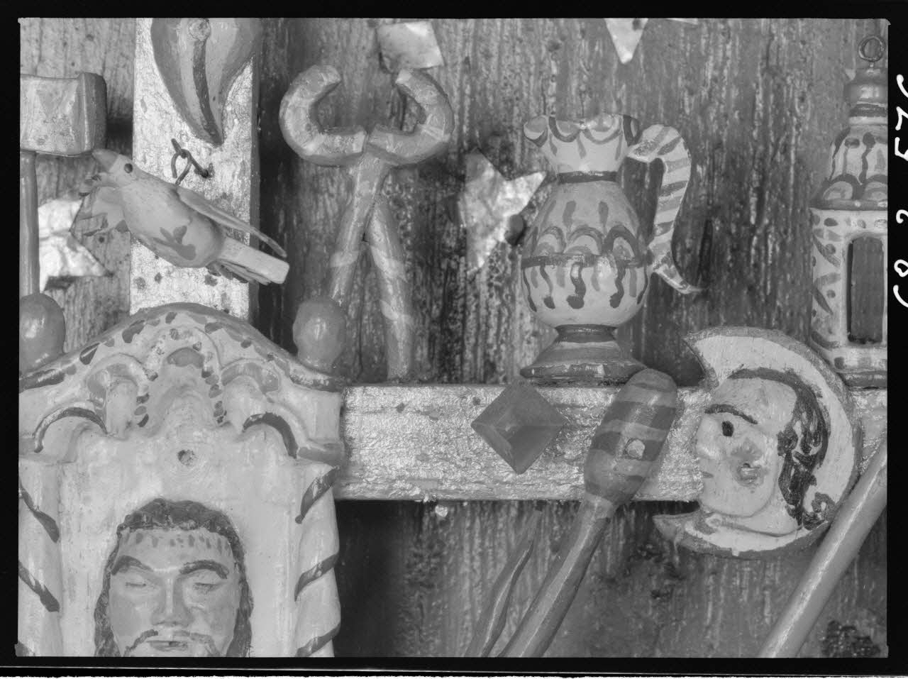 photographie, Croix en bois polychrome, accompagnée des attributs de la Passion. Sous verre. Détail