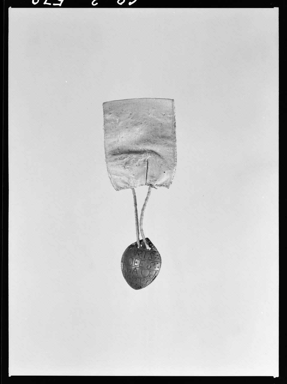 photographie, Affiquet constitué d'un noyau, et accroché à un ruban de soie rose. Provenant du Maine-et-Loire