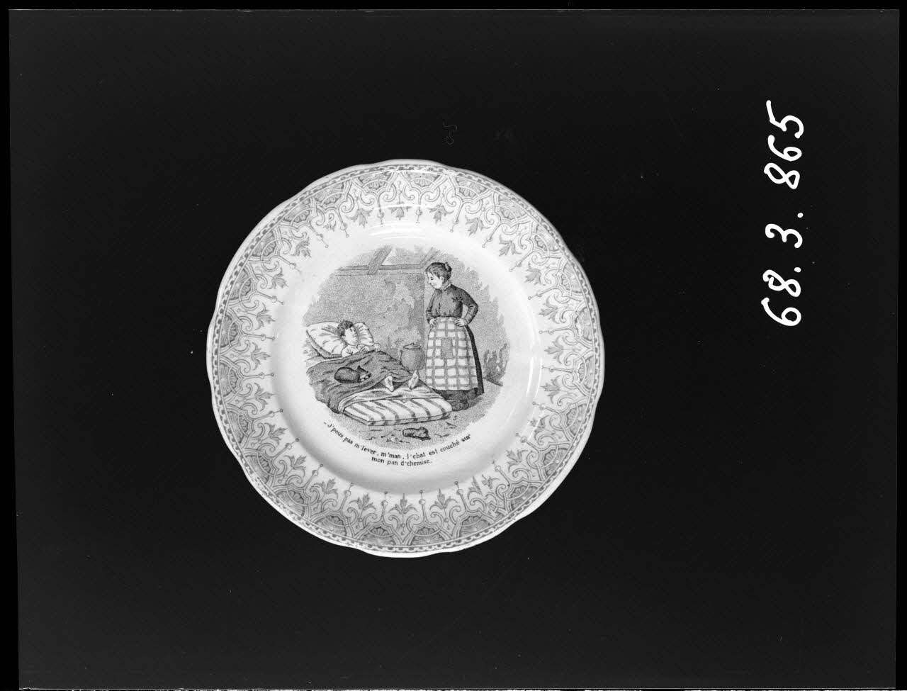 photographie, Assiette en faïence "Digoin-Sarreguemines". Inscription: "J'peux pas m'lever, m'man, l'chat est couché sur mon pan d'chemise"