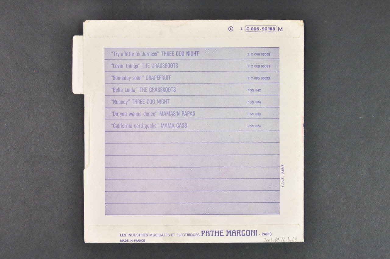 Une languette est présente sur le côté supérieur droit sur laquelle sont inscrits le nom du groupe et un numéro.