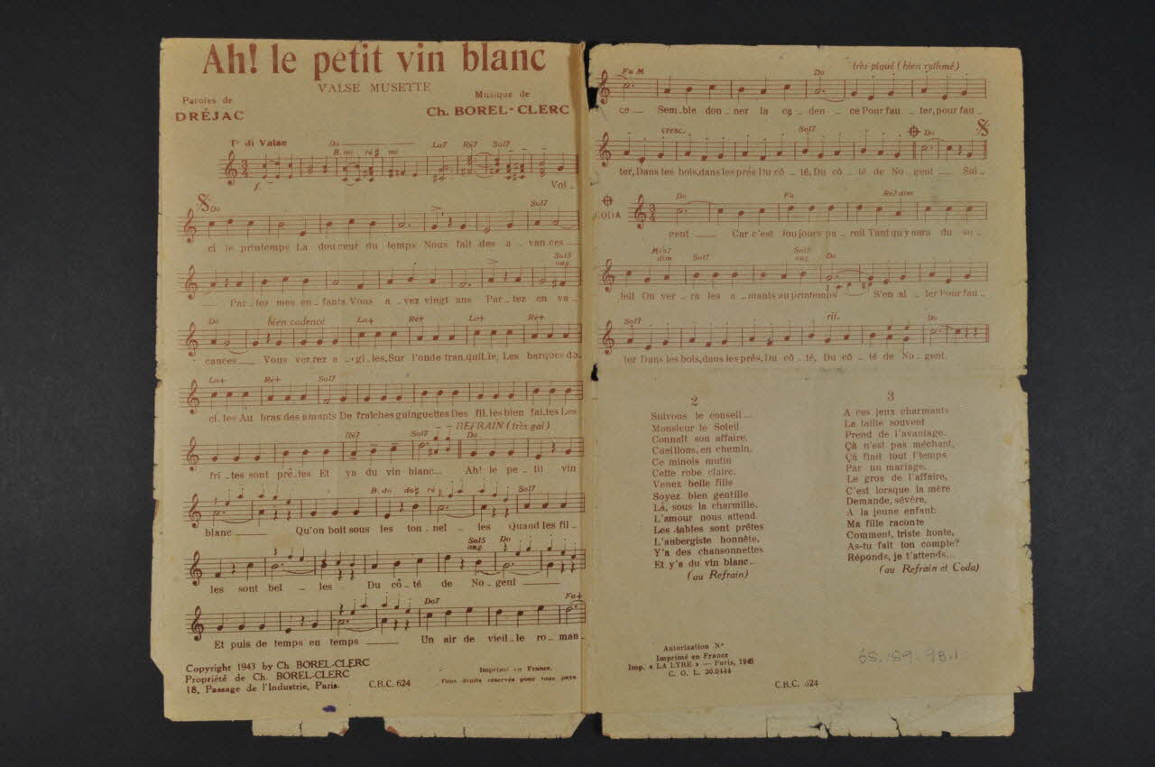 Des inscriptions renseignent le titre, les auteurs, les exécutants et l'éditeur. A l'intérieur et au dos, les partitions et paroles des chansons.Matériaux et techniques