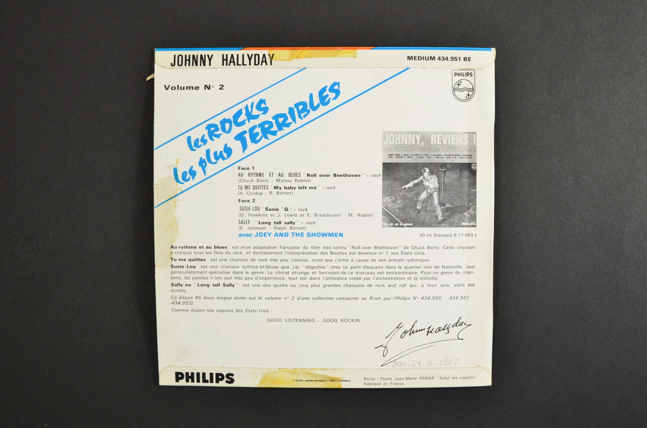 Le recto, présente la photographie du chanteur en train de chanter les deux bras tendus. La partie haute comporte une bande bleue horizontale avec le nom du chanteur en blanc et des inscriptions noires. Le verso, de fond blanc, comporte des inscriptions noires et bleues accompagnées de la photographie d'une pochette de disque en miniature sur la droite.Matériaux et techniques