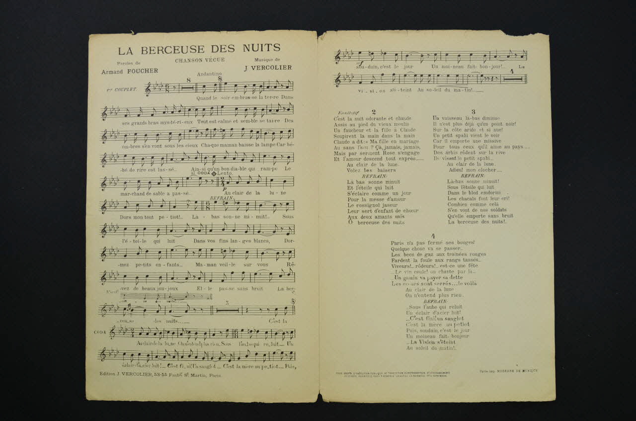 Les inscriptions renseignent le titre de la chanson, le nom des auteurs, de l'artiste et de l'éditeur. A l'intérieur, partitions et paroles de la chanson. Au dos, liste d?autres partitions publiées par l?éditeur.Matériaux et techniques