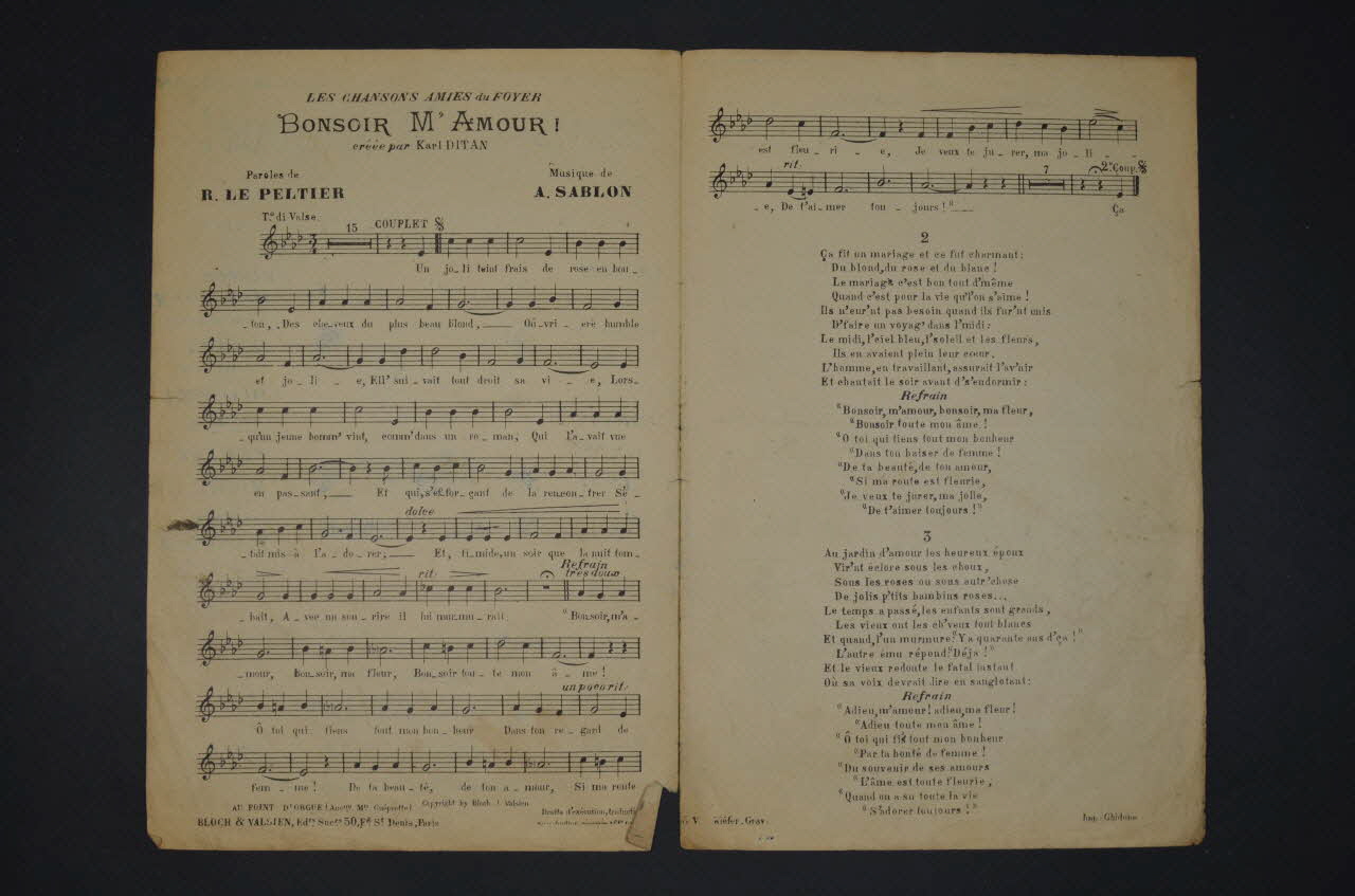 Sur la couverture, le portrait photographique de Karl Ditan entouré de roses. Les inscriptions renseignent le titre de la chanson, le nom des auteurs, des artistes et de l'éditeur. A l'intérieur, partition et paroles de la chanson. Au dos, liste d'autres partitions publiées par l'éditeur.Décor