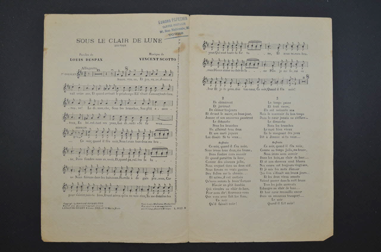 EDMOND PAPEGHIN // CARTES POSTALES // 26, Rue Nationales, 26 // TOURS (Dans l'angle supérieur droit de la deuxième page, un tampon publicitaire à l'encre bleue.)Matériaux et techniques