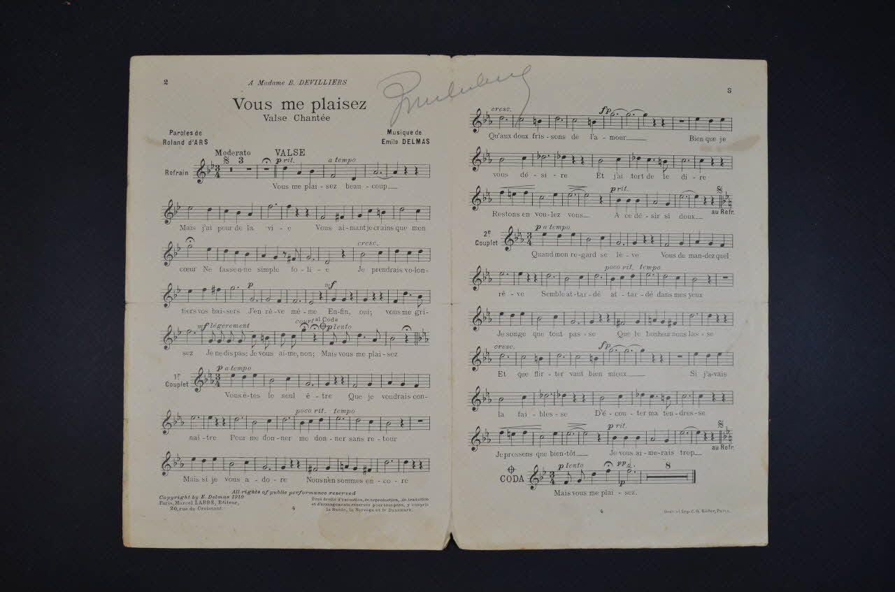 Des inscriptions renseignent le titre, les auteurs, les exécutants et l'éditeur. A l'intérieur, partition et paroles de la chanson. Le dos est laissé vierge.Matériaux et techniques