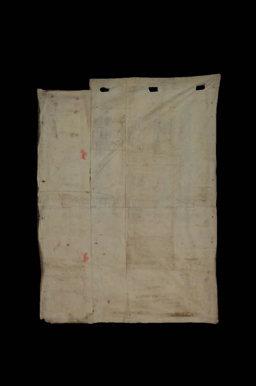 Ce ruban en toile tissée et peinte est de forme rectangulaire et est constitué de deux bandes de tissus cousues entre elles.