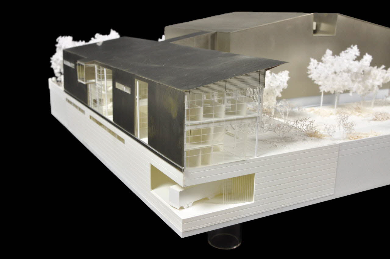 Elle est constituée d'une base en forme de trapèze irrégulier dont l'un des côté est légèrement concave. Elle est épaisse d'environ cinq centimètres et constituée de matériau synthétique jaune sous la base et blanc moucheté de gris sur les tranches. Elle repose sur quatre pieds circulaires creux en plexiglas transparent disposés aux quatre angles. Elle présente deux côtés parallèles considérés comme la longueur de la maquette. La partie supérieure de la maquette est réalisée en plastique, bois, plexiglas transparent et métal. Longeant le plus long des côtés, un bâtiment rectangulaire allongé, à toit à double pente strié peint en blanc. Le même type de bâtiment, plus bas, longe le côté concave. Sur le petit côté rectiligne et au milieu de la parcelle sont visibles les deux bâtiment neufs. Le bâtiment au centre présente un plan rectangulaire, une base blanche et un revêtement en plaques de métal gris foncé. A la base des quatre côtés, de petites grilles métalliques peintes en blanc. Le toit est à double pente mais son arête centrale présente une encoche sur toute sa longueur. Dans la galerie rectangulaire ainsi formée sont visibles six éléments rectangulaires en métal, posés sur un cube de plexiglas et couronnés par une grille en métal. Ils figurent probablement des aérations. Les murs latéraux de la galerie sont aussi caractérisés par des grilles d'aérations, six d'un côté et sept de l'autre. Sur un des pans du toit, sous des plaques de plastique transparent sont figurées quatre séries de panneaux solaires. Sur l'un des petits côtés de ce bâtiment central est présente une passerelle le reliant au bâtiment longeant le petit côté rectiligne.Elle est constitué de plastique transparent, de plaques de métal et dans sa partie supérieure de grilles en métal. Le bâtiment longeant le petit côté rectiligne, sur plan rectangulaire, est situé sur une partie légèrement surélevée de la parcelle. Elle présente un toit à une pente en métal et sa façade vers l'extérieur de la parcelle est aussi en métal. Cette façade est assez complexe : elle présente des zones pleines en métal, des zones en plastique transparent quadrillé laissant voir l'intérieur du bâtiment, et deux cours, dont l'une est ornée d'un arbre. La façade vers l'intérieur de la parcelle présente une galerie à colonnes sur deux niveaux au rez-de-chaussée, dont certaines zones sont fermées à l'aide de plastique transparent. Le troisième étage est en plastique transparent et le dernier niveau est caractérisé par des grilles métalliques. La distribution intérieure est visible, ainsi que les nombreux escaliers reliant les niveaux. On note un escalier extérieur à quatre paliers reliant tous les niveaux. Il est réalisé en plastique mat et en métal. Sur la tranche du petit côté sont visibles certaines parties du sous-sol du bâtiment. Sur un des angles, une ouverture permet de voir le quai de déchargement, avec deux camions. Des baies vitrées permettent aussi de voir un dédale de pièces à l'intérieur. Elle sont éclairées par une baie vitrée située au sol le long de la façade vers l'intérieur de la parcelle du bâtiment. A l'angle entre le petit côté rectiligne et le plus long côté, une petite cour sur laquelle donne l'entrée du bâtiment longeant le côté, avec un large escalier à deux volées. L'angle en question est coupé en biais et présente un portail. Trois silhouettes de voitures suggèrent que cette cour sert de parking. Les espaces entre les quatre bâtiments sont ornés d'arbres constitués de fil de fer peint en blanc et de coton, ainsi que de mousse et de petites tiges végétales. Autour des voies de circulation antour des bâtiments, le sol est figuré de manière irrégulière grâce à un revêtement blanc pour évoquer une pelouse. La galerie séparée se plaçait dans la partie saillante de la façade extérieure du bâtiment longeant le petit côté rectiligne et constituait une passerelle vers un autre bâtiment. Dans les bâtiments et dans les espaces extérieurs sont visibles plusieurs silhouettes de personnages peints en blanc, notamment trois dans la galerie séparée.Matériaux et techniques