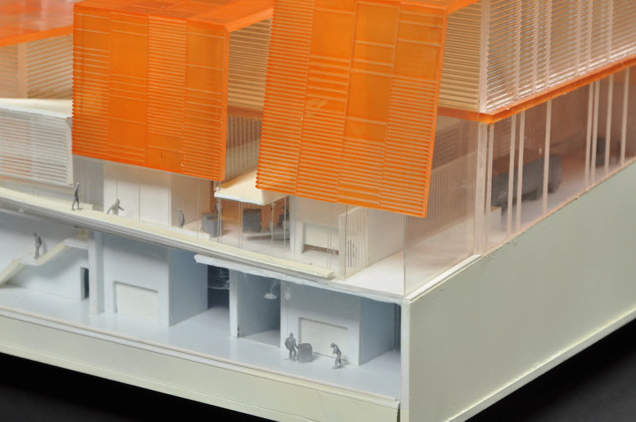 Elle est construite sur un socle circulaire tournant, en plastique et caoutchouc gris moulés. La maquette en elle-même possède une base trapézoïdale, conformément à la parcelle du site du centre de conservation. L'un des côtés est légèrement concave. L'angle perpendiculaire du long côté est coupé en biais. Le premier niveau, en plastique peint en blanc, est aveugle sur trois de ses côtés, tandis que le quatrième est muni d'une ouverture fermée par une fine plaque de plastique transparent, permettant de voir l'intérieur. Au-dessus s'échelonnent les cinq bâtiments du projet proposé. Ils sont rectangulaires, allongés et de différentes hauteurs, alignés parallèlement au long côté de la maquette. Leurs murs sont en plexiglas transparent incolore et en plastique mat ou transparent, et leurs toits en plexiglas transparent orange. Les façades transparentes permettent de voir à l'intérieur des bâtiments. Le bâtiment situé le long du petit côté est lié à la logistique avec un quai de déchargment et un camion peint en gris. Les autres espaces intérieurs présentent des salles, des escaliers, certaines pièces de mobilier peintes en gris. Dans les bâtiments et dans les cours sont visibles de nombreux personnages en métal, dans des positions différentes. Le long côté et le côté légèrement courbe sont bordés de deux bâtiments à toit à deux pans non détaillés, peints en blanc, qui doivent figurer les bâtiments existants sur la parcelle. Les espaces non construits sont ornés des arbres en mousse sur une tige en métal peint en blanc.Matériaux et techniques