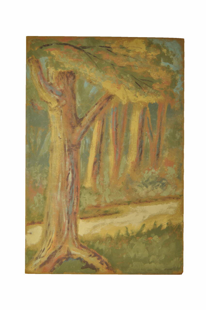 Sur une face, figure la représentation d'une foret. Au premier plan, apparaît un arbre. Au second plan se trouve un sentier jaune. L'arrière plan est occupé par une forêt.