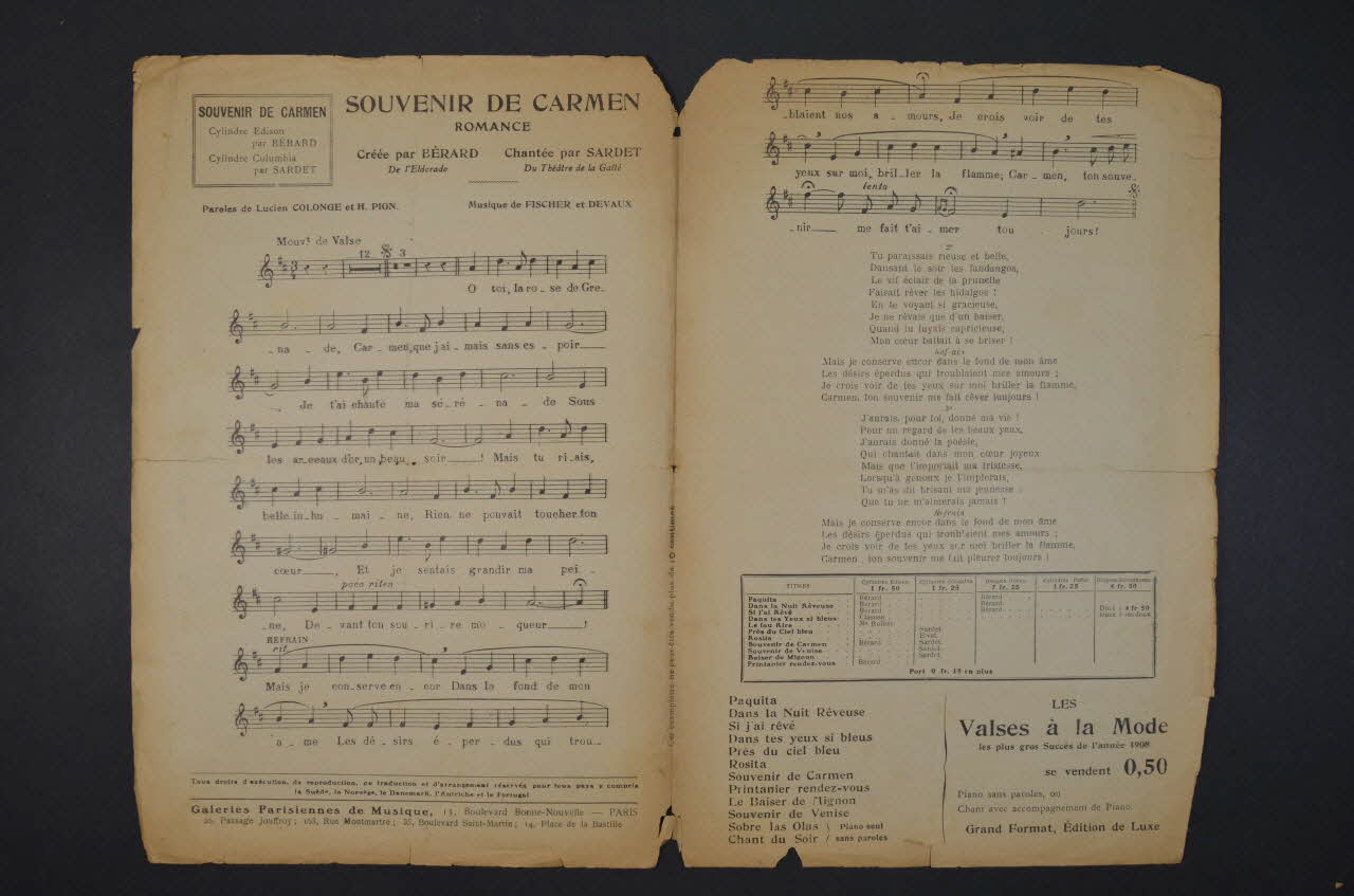 chanson, partition de musique, petit format, Souvenir de Carmen