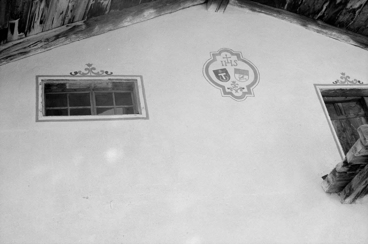 photographie, Enquête conduite par Jean Cuisenier en Suisse (du 25 mars au 8 avril 1972), Détail d'un motif décoratif traditionnel récemment peint sur la façade d'un chalet