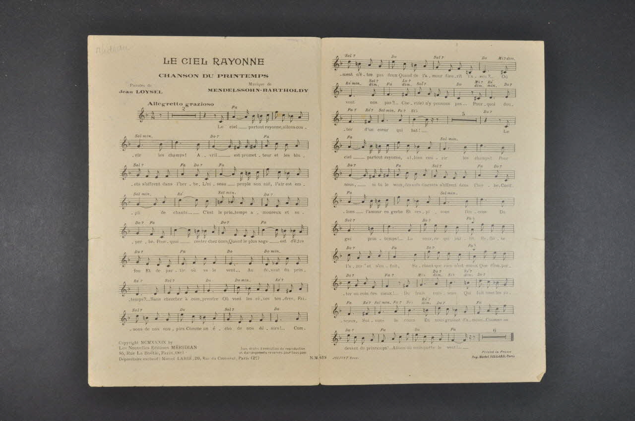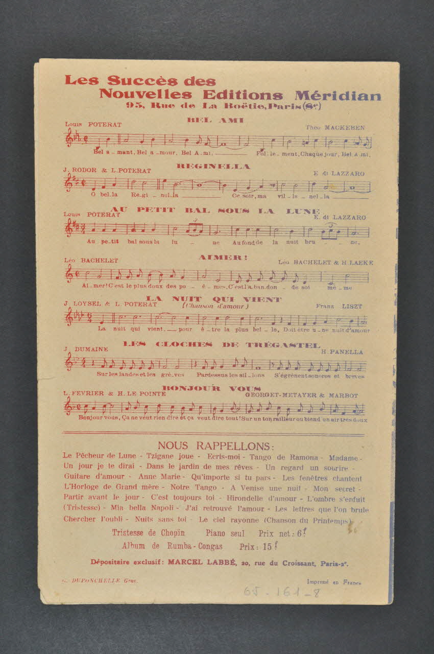 Les inscriptions renseignent le titre de la chanson, le nom des auteurs, de l'artiste et de l'éditeur. A l'intérieur, partitions et paroles de la chanson. Au dos, liste d?autres partitions publiées par l?éditeur.Décor