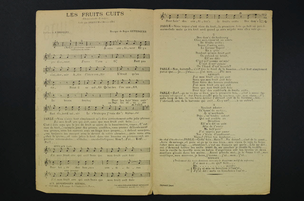 Les inscriptions renseignent le titre de la chanson, le nom des auteurs, de l'artiste et de l'éditeur. A l'intérieur, partition et paroles de la chanson. Au dos, liste d?autres partitions publiées par l?éditeur.Décor