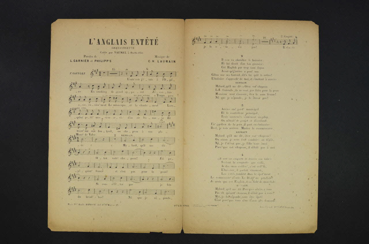Les inscriptions renseignent le titre de la chanson, le nom des auteurs, de l'artiste et de l'éditeur. A l'intérieur, la partition et les paroles. Au dos, une liste de titres disponibles chez le même éditeur.Décor