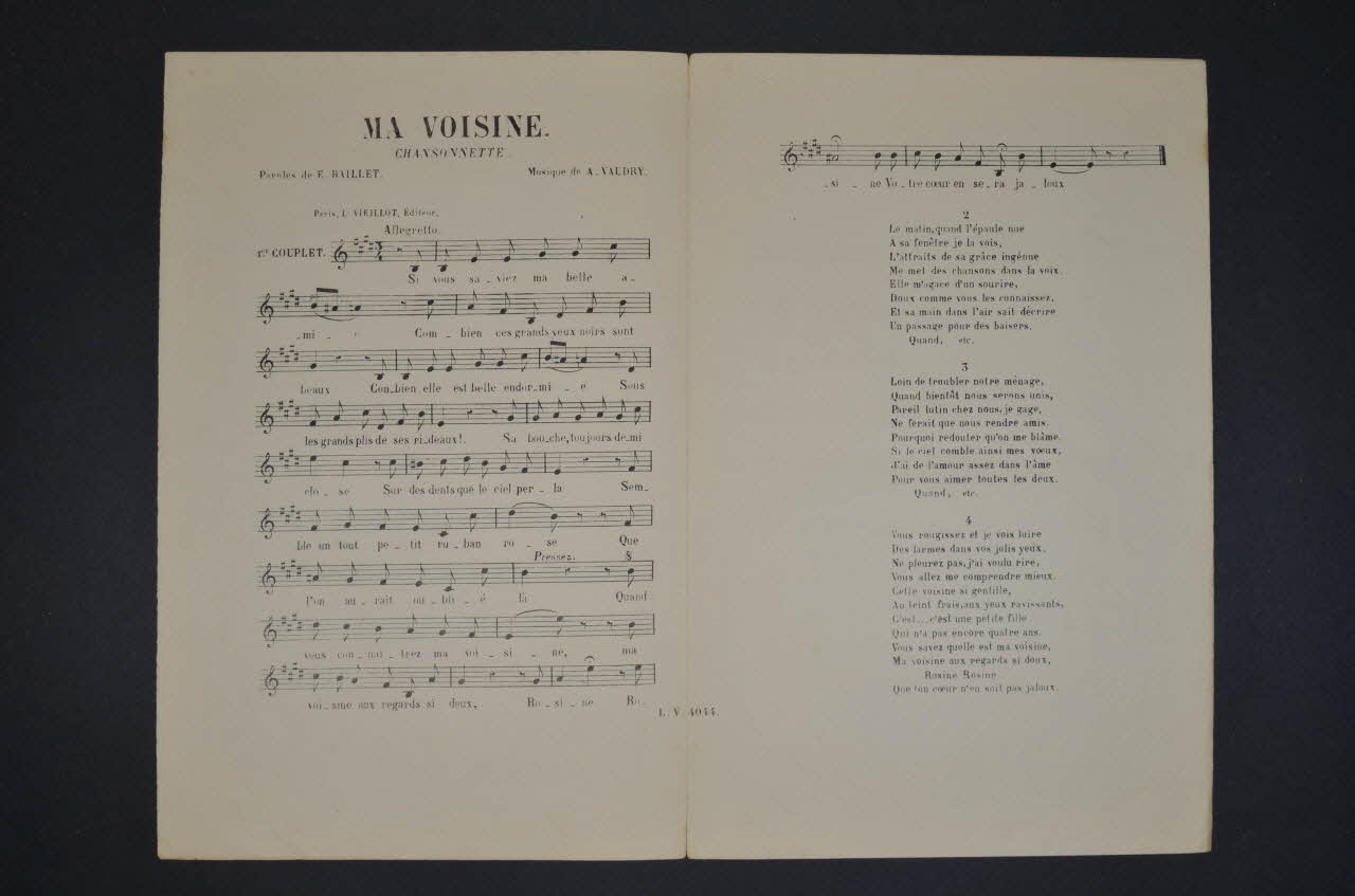 Sur la couverture, la représentatino d'une scène d'intérieur : femme assise sur une chaise et homme debout, devant une fenêtre ouverte, pointant du doigt vers l'extérieur ; au-dessus, représentation d'une petite fille à un balcon, environnée de branches fleuries. Les inscriptions renseignent le titre de la chanson et le nom des auteurs. A l'intérieur, partition et paroles de la chanson. Le dos est laissé vierge.Décor