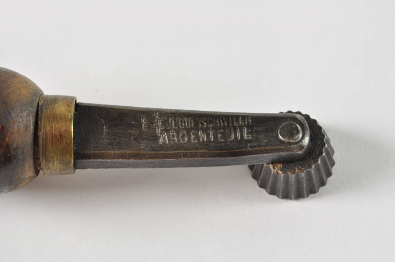 Petit ciselet à molette crantée, sertie sur une tige en acier courte et recourbée de section rectangulaire, à emmanchement à scie sur manche de bois tourné. Une virole en cuivre soutient l'emmanchement. Un rectangle en cuir percé d'un trou est fixé à l'extrémité du manche au moyen d'un clou, permettant la fixation.Inscriptions