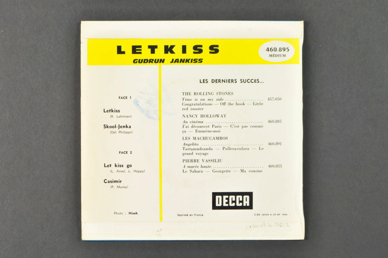 Au recto le fond représente la photo, en couleur, d'une femme est d'un homme en train de danser, sur un fond bleu. A droite figurent le titre et un logo.