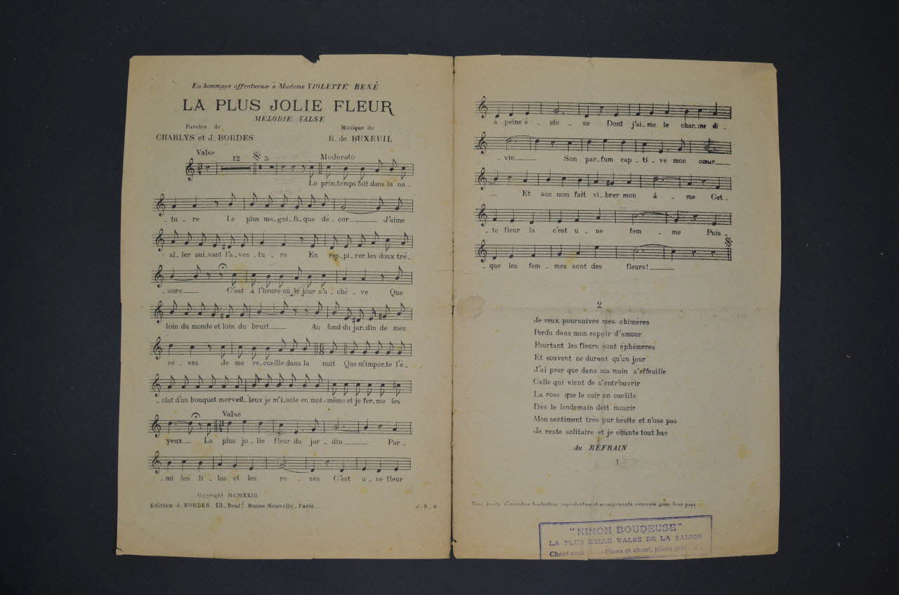 Sur la couverture, le portrait photographique de René de Buxeuil jouant du piano encadré de deux vases fleuris. Les inscriptions renseignent le titre de la chanson, le nom des auteurs, de l'artiste et de l'éditeur. A l'intérieur, partition et paroles de la chanson. Le dos est laissé vierge.Inscriptions