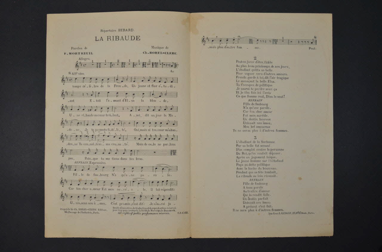 Des inscriptions renseignent le titre, les auteurs, les exécutants et l'éditeur. A l'intérieur, partition et paroles de la chanson. Au dos, liste d'autres partitions publiées par l'éditeur.Matériaux et techniques