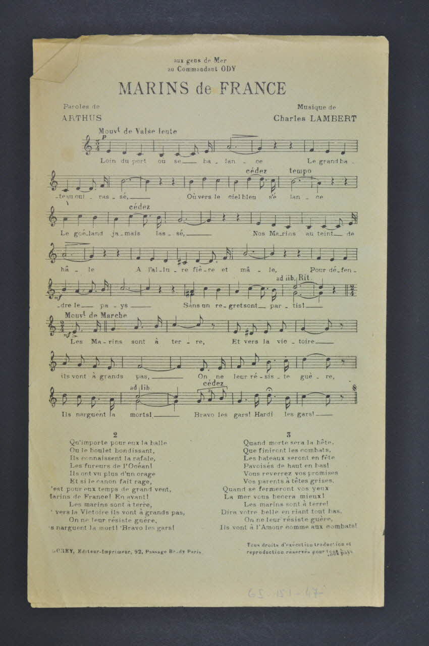 Au recto, le portrait photographique d'Yvonneck avec encadrement d'arabesques, accompagnant les inscriptions qui renseignent le titre de la chanson, le nom des auteurs, de l'artiste et de l'éditeur. Au verso, partition et paroles de la chanson.Matériaux et techniques