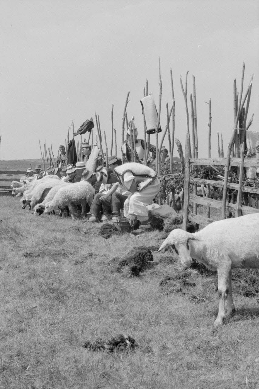 - Scène : homme : roumain : berger, costume : roumain, traite : brebis, seau, enclos