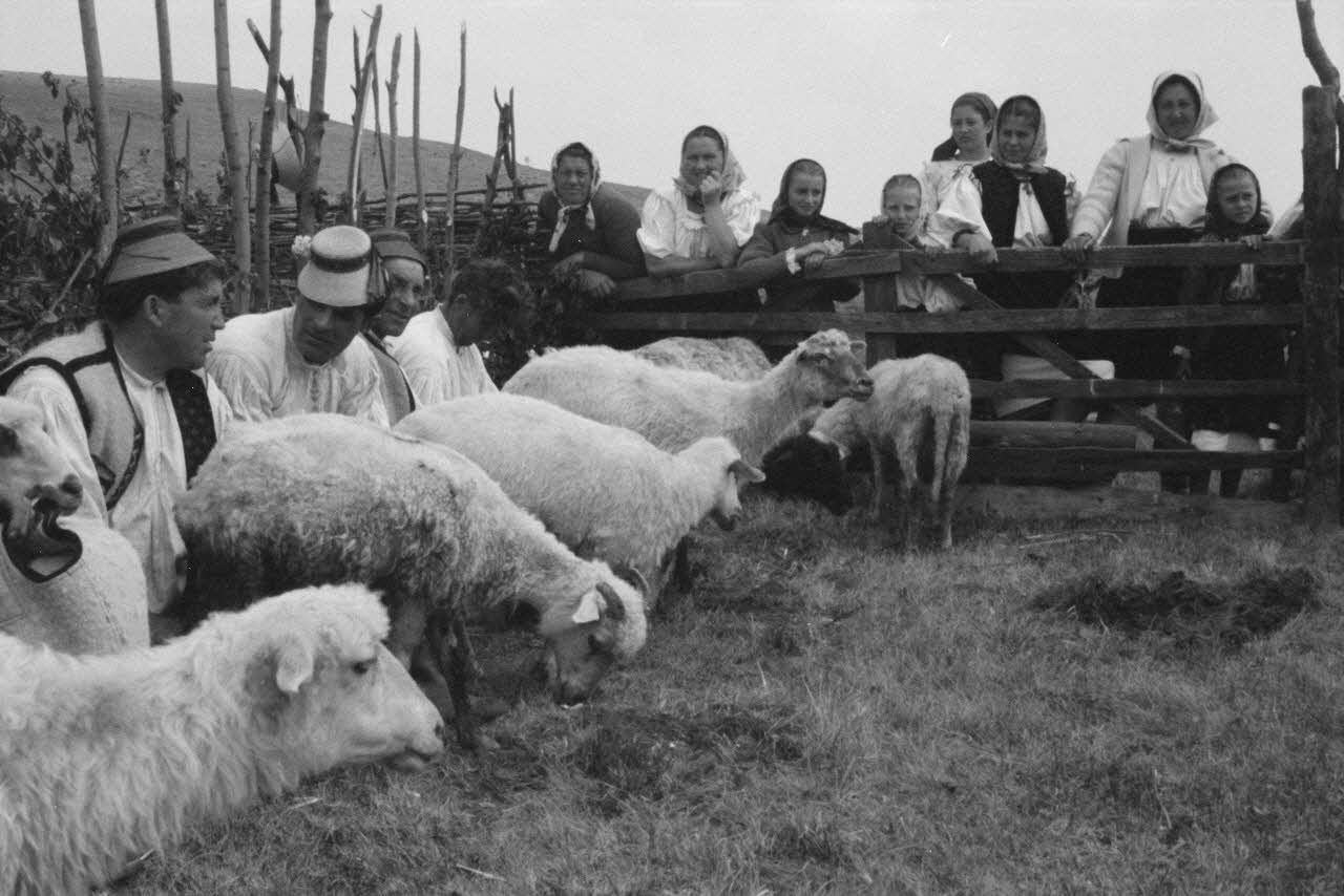- Scène : groupe, homme : roumain : berger, femme : roumain, costume : roumain, traite : brebis, enclos