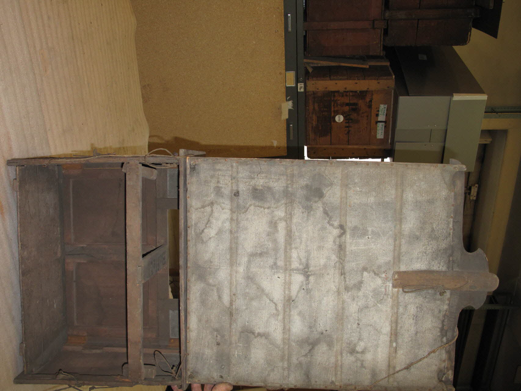 bois, métal et toile peinte à la colle marron et noir / composé de sept éléments démontés : vaisselier, fond, buffet (trois côtés assemblées par quatre charnières et quatre autres pour les portes), dessus, deux traverses à tiroir, tiroir ; structures en bois garnies de décors peints sur toileMatériaux et techniques