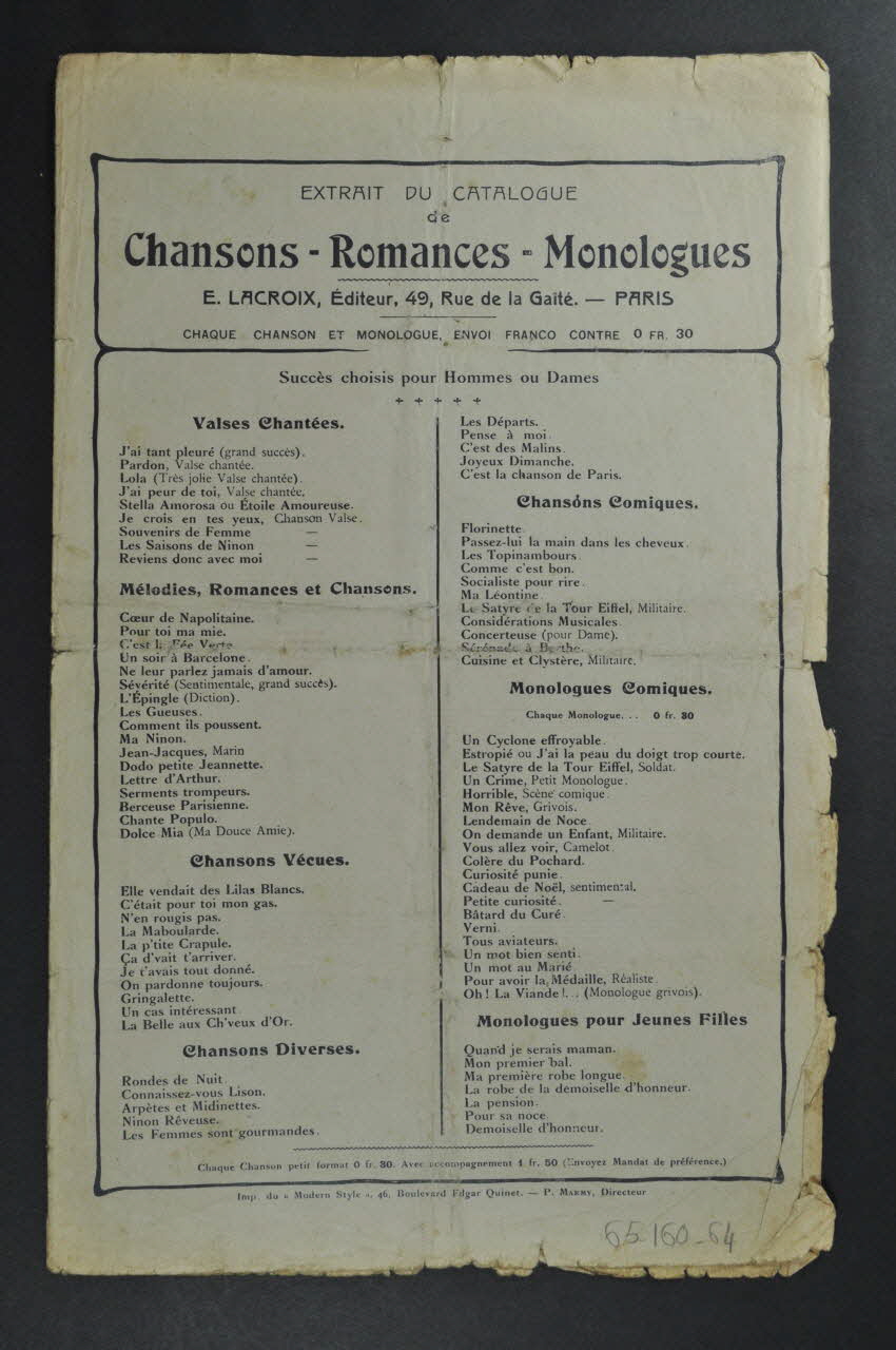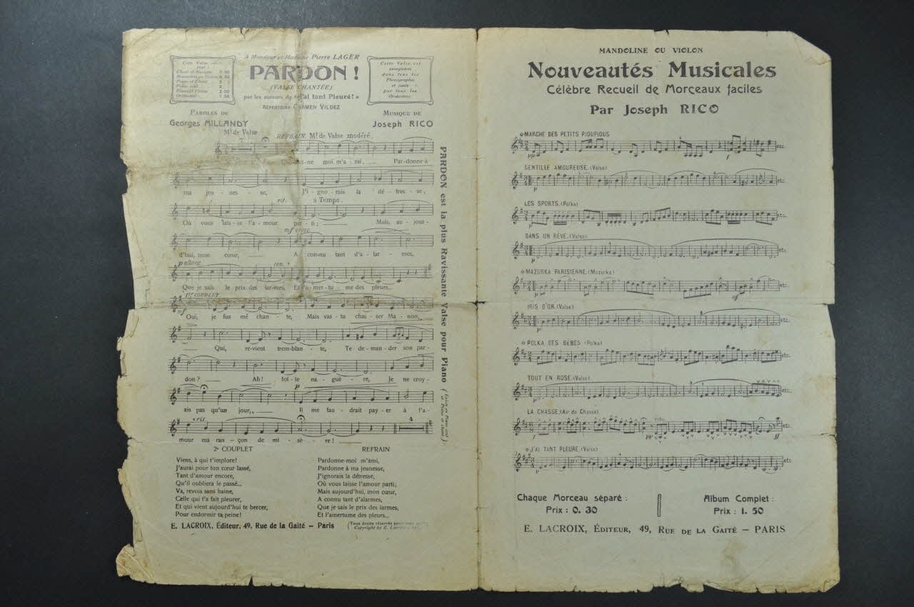 Les inscriptions renseignent le titre de la chanson, le nom des auteurs, de l'artiste et de l'éditeur. A l'intérieur, partitions et paroles de la chanson. Au dos, liste d?autres partitions publiées par l?éditeur.Décor