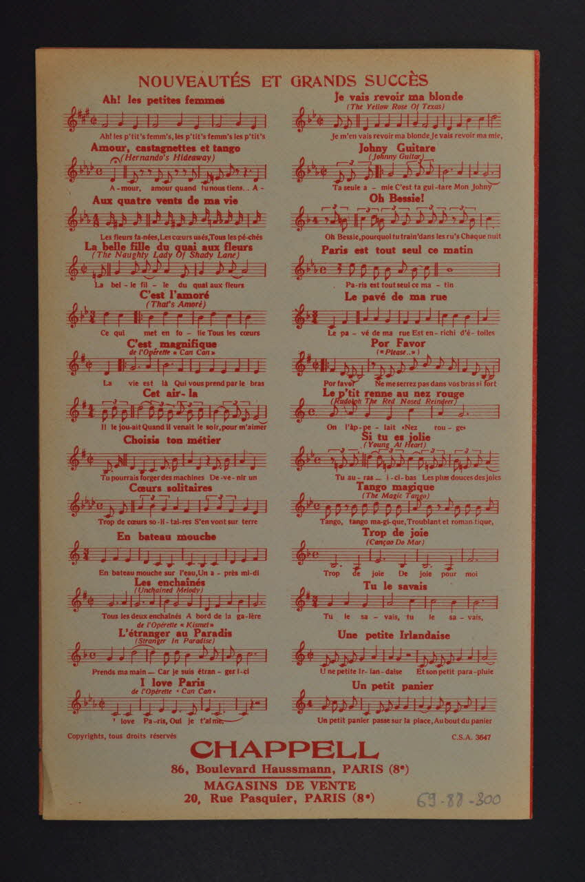 Des inscriptions renseignent le titre, les auteurs, les exécutants et l'éditeur. A l'intérieur, partition et paroles de la chanson. Au dos, liste d'autres partitions publiées par l'éditeur.Dimensions et poids