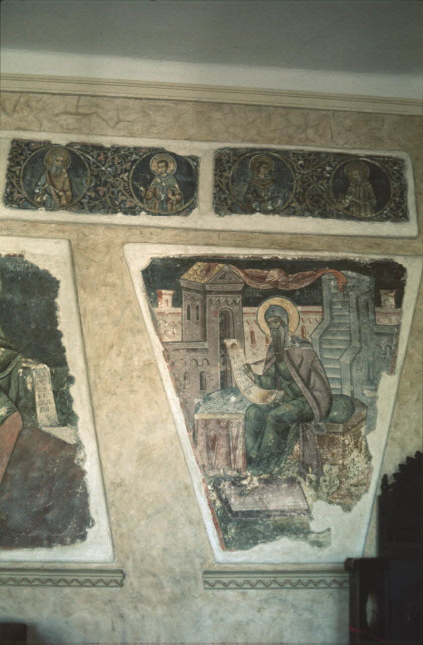 - Vue d'intérieur : fresque : style byzantin, saint, écriture, auréole, phylactère, meuble, cadre urbain, médaillon orn, rinceau