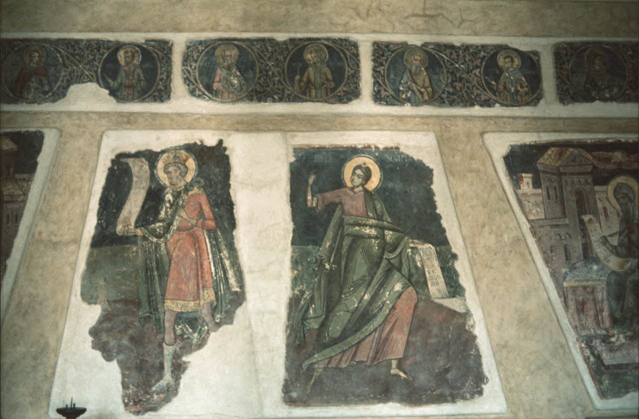 - Vue d'intérieur : fresque : style byzantin, saint, auréole, phylactère, médaillon orn, rinceau