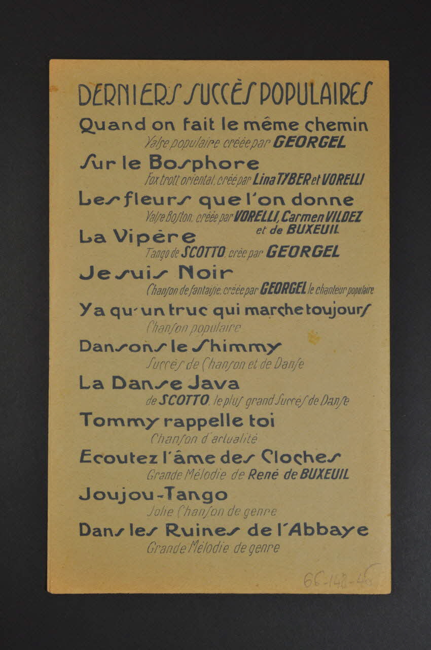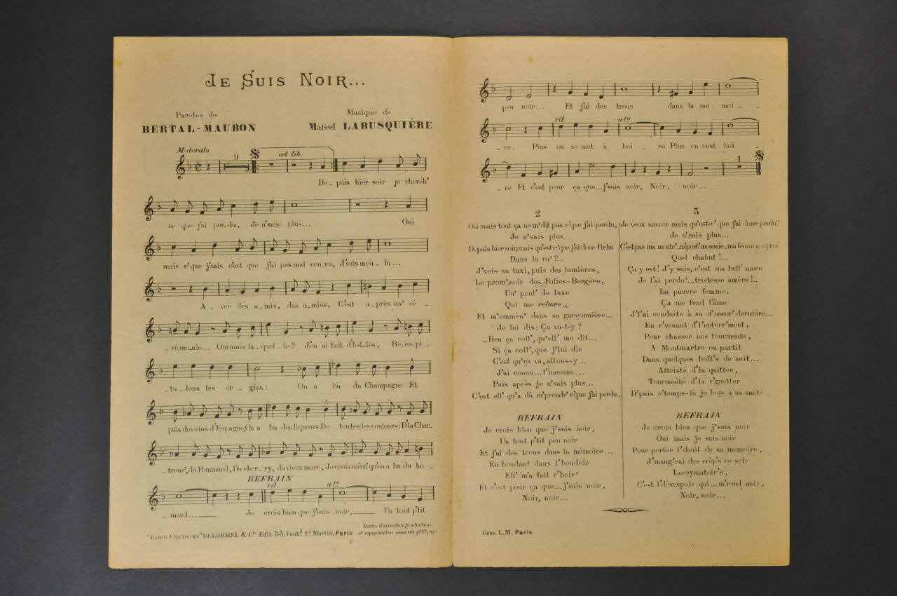 Des inscriptions renseignent le titre, les auteurs, les exécutants et l'éditeur. A l'intérieur, partition et paroles de la chanson. Au dos, liste d'autres partitions publiées par l'éditeur.Matériaux et techniques