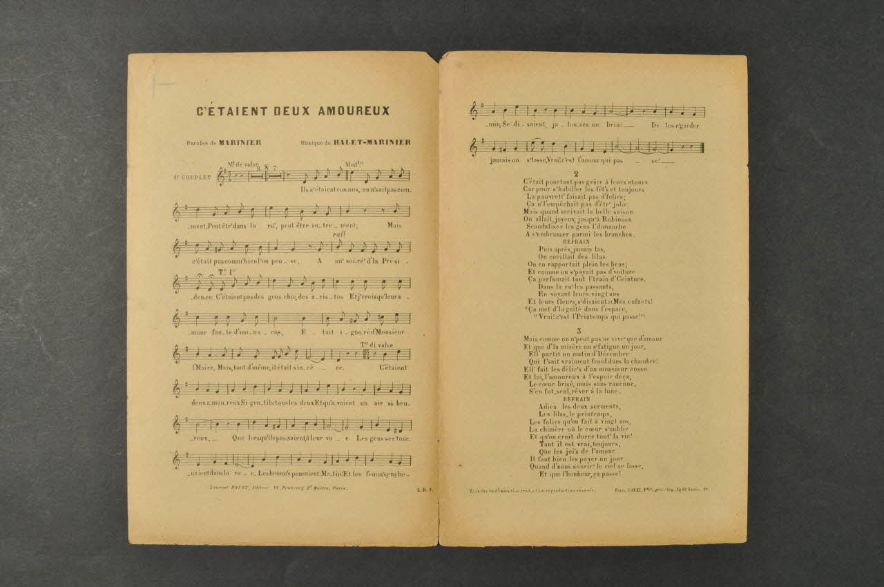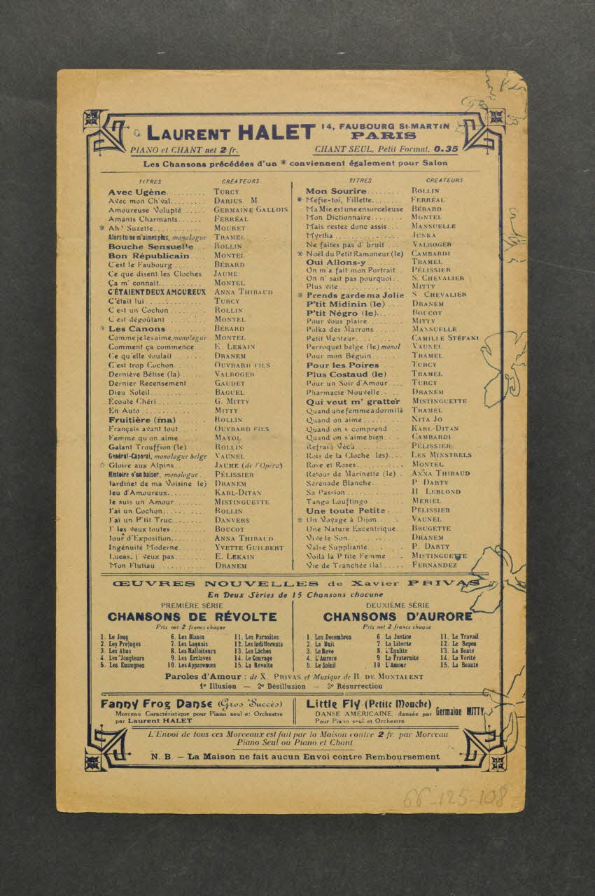 Des inscriptions renseignent le titre, les auteurs, les exécutants et l'éditeur. A l'intérieur, partition et paroles de la chanson. Au dos, liste d'autres partitions publiées par l'éditeur.Décor