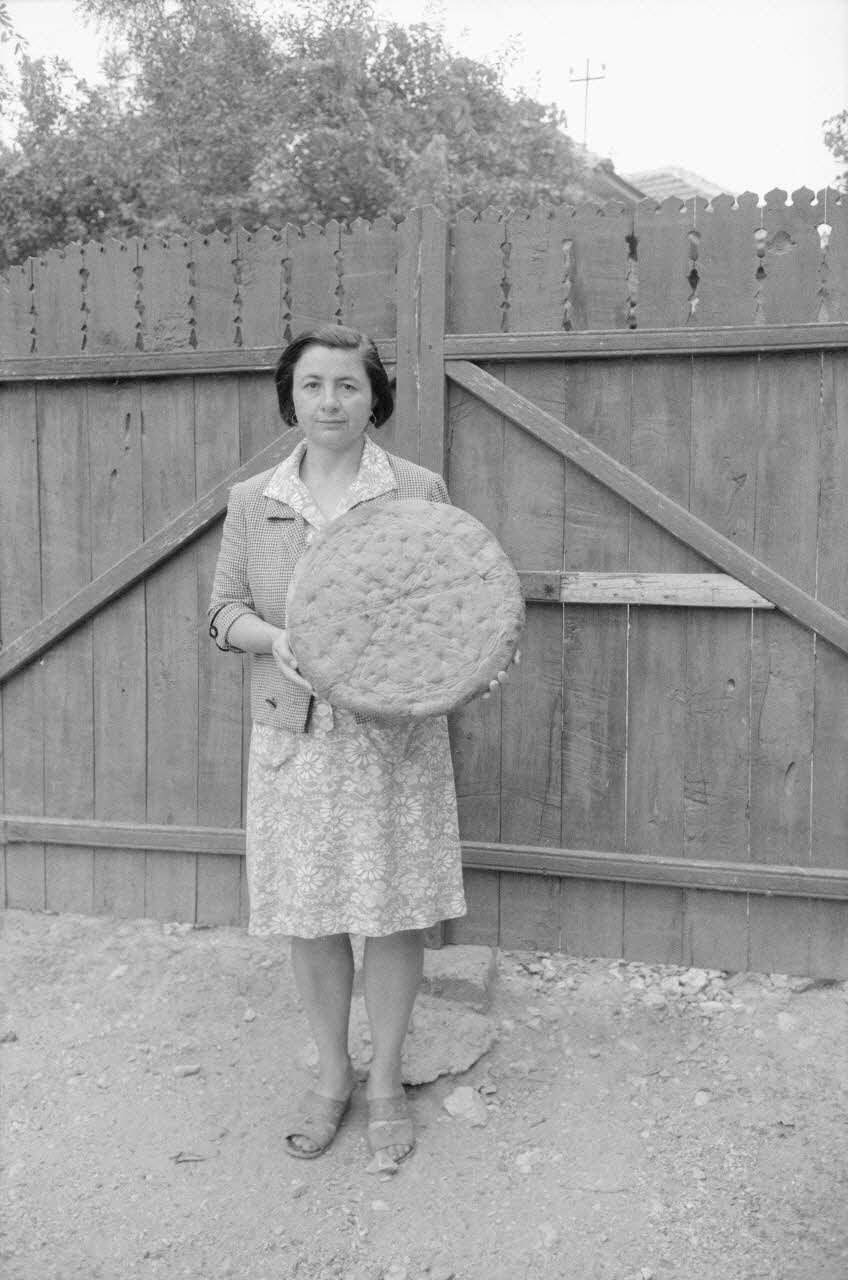 photographie, Enquête conduite par Jean Cuisenier en Roumanie (septembre 1975), Pain de test chauffé à la paille de blé, apporté par Virgil à sa femme Victoria, en provenance du village de Virgil
