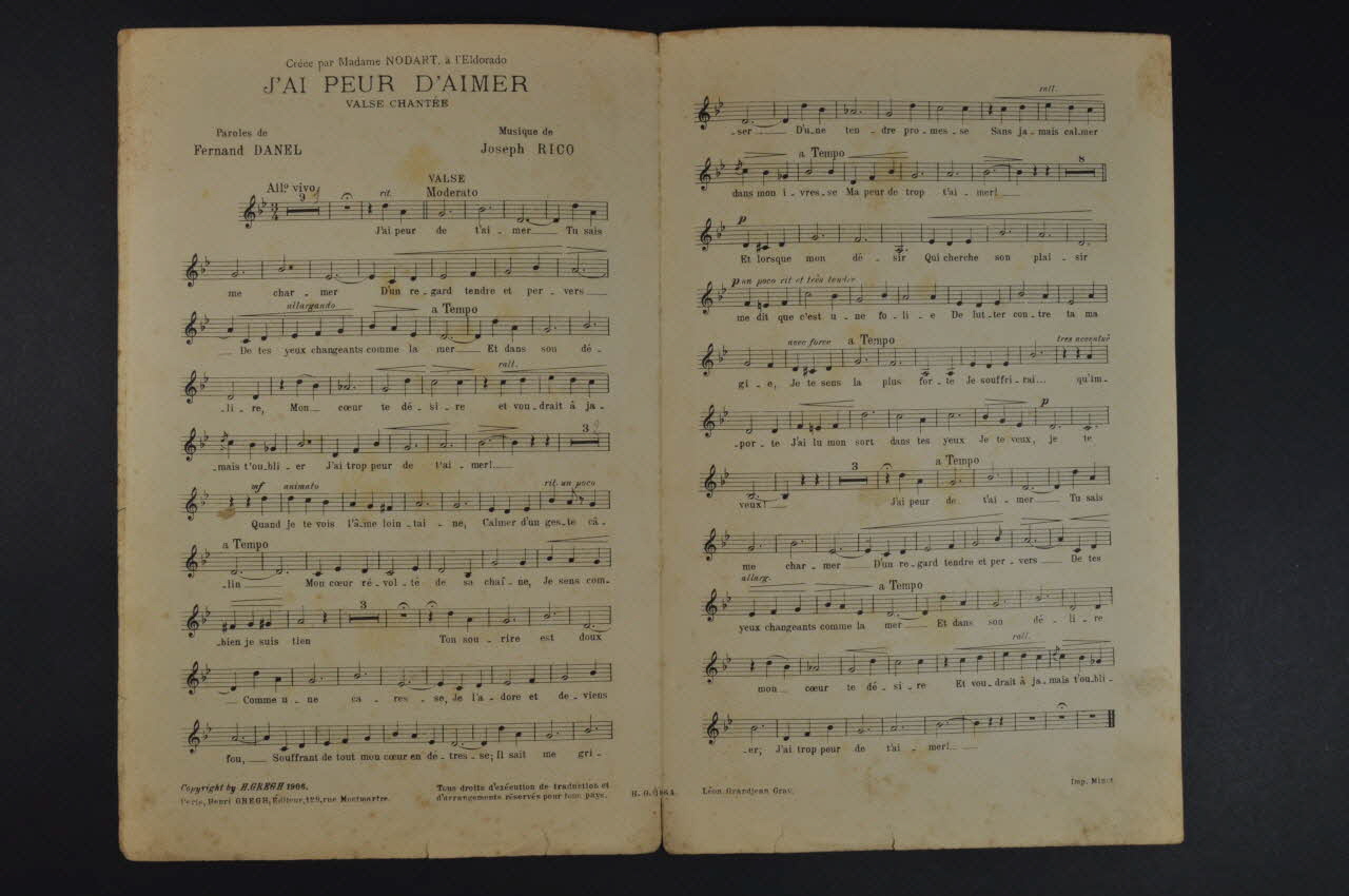 Les inscriptions renseignent le titre de la chanson, le nom des auteurs, de l'artiste et de l'éditeur. A l'intérieur, partitions et paroles de la chanson. Le revers est laissé vierge.Décor