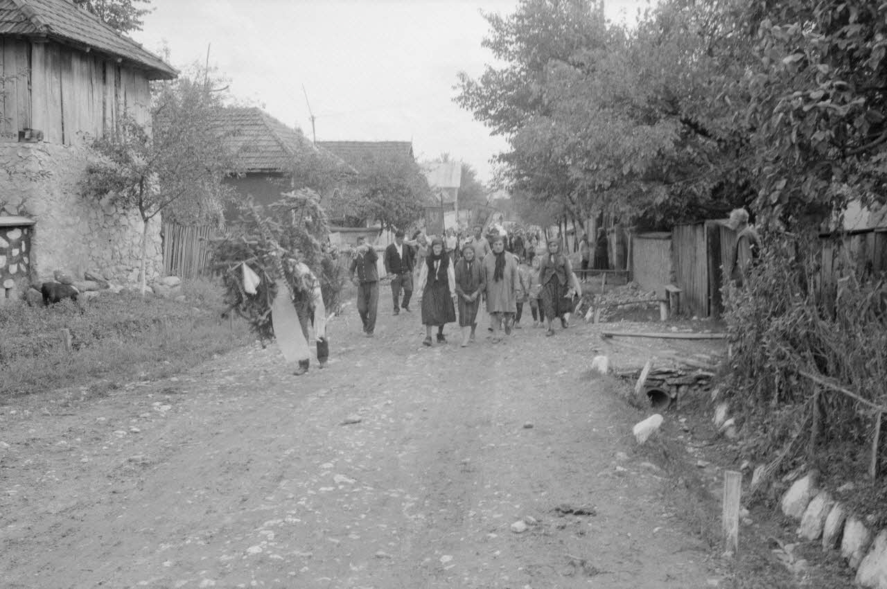 - Scène : convoi funèbre, roumain, branche : sapin, rue, homme, femme, maison, arbre