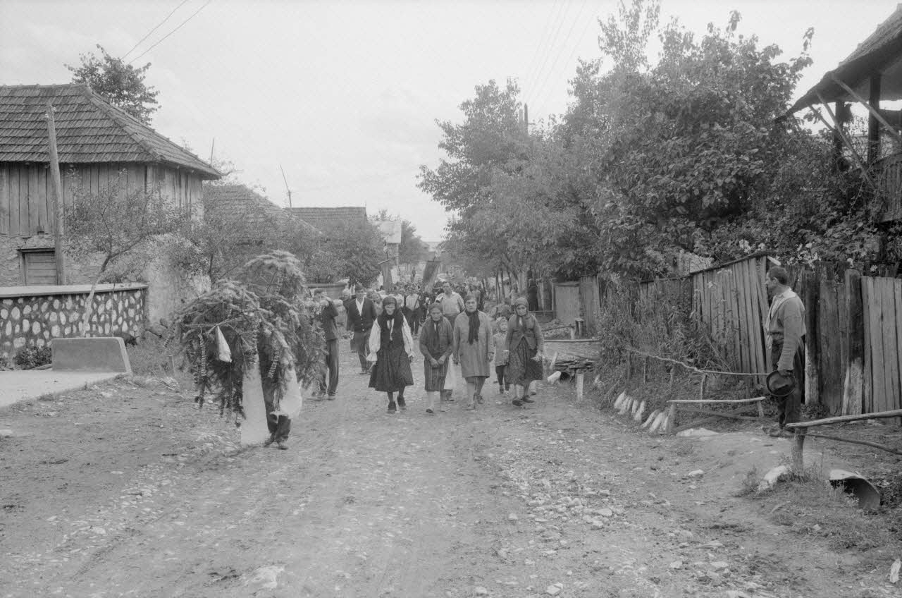 - Scène : convoi funèbre, roumain, branche : sapin, homme, femme, rue, maison, arbre