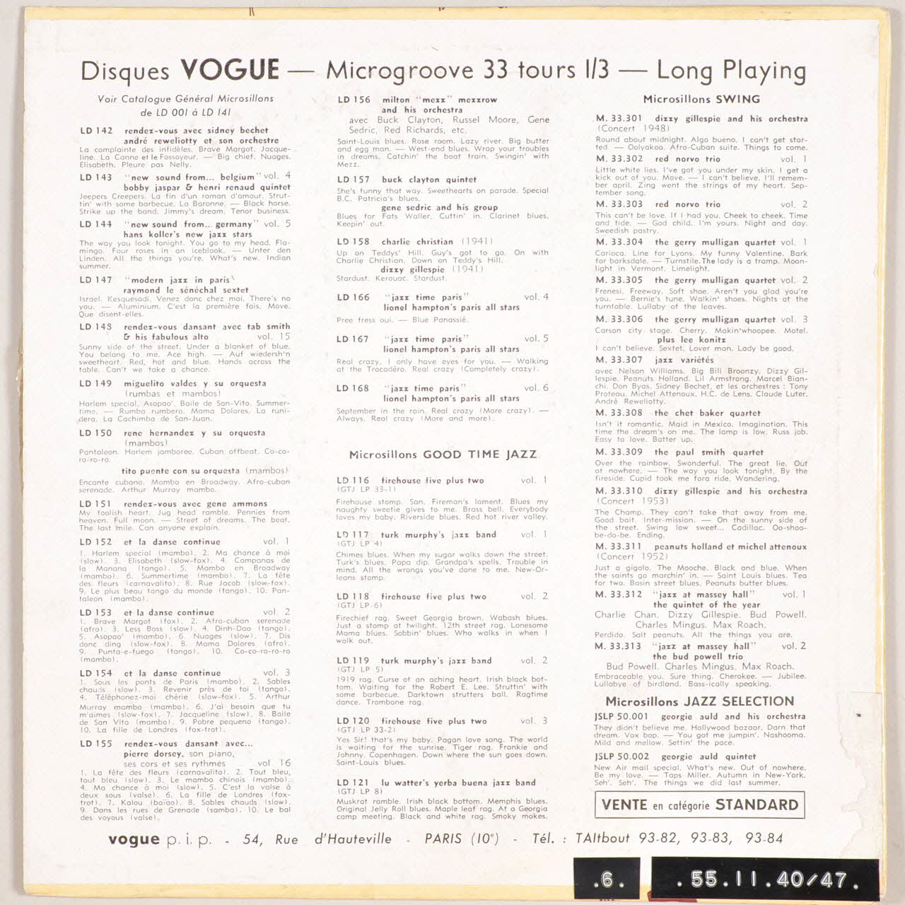 Au dos, liste des autres disques Vogue Microgroove 33 tours. Au centre du disque, sur les deux faces, une étiquette circulaire en papier imprimé de couleur rouge et blanche avec une écriture noire renseignant les titres, auteurs, exécutants et éditeur.Décor