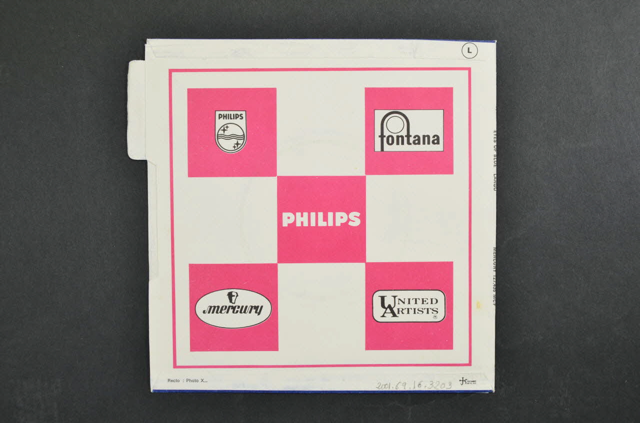 Le recto, de fond bleu, comporte la photographie des membres du groupe dans un cercle au contour bleu. leur nom est inscrit en bleu au dessus. les titres des chansons se trouvent dans le haut et la bas en lettres blanches.Des inscriptions au stylo se trouvent dans la partie droite.