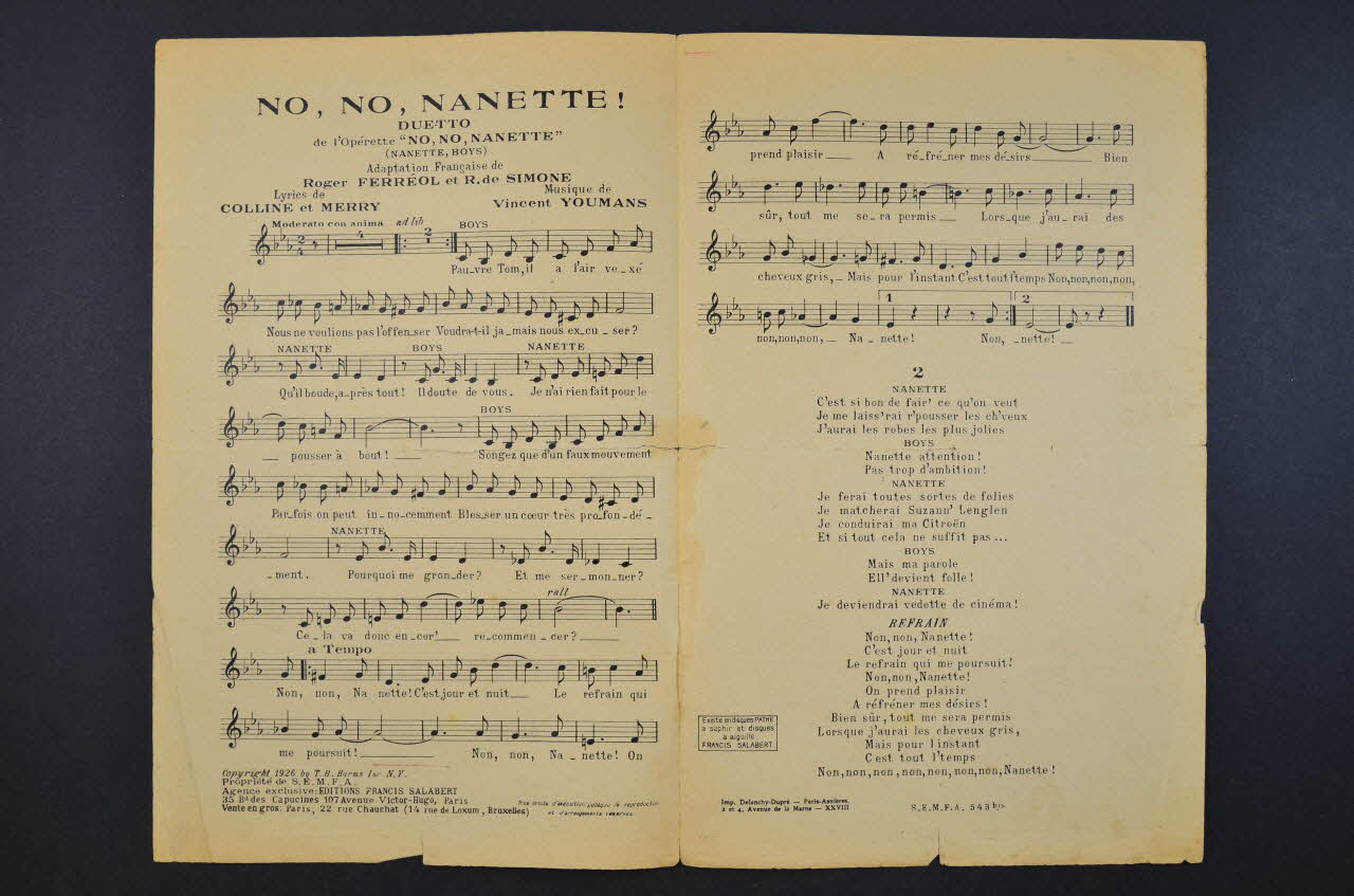 Les inscriptions renseignent le titre de la chanson, le nom des auteurs, de l'artiste et de l'éditeur. A l'intérieur, partitions et paroles de la chanson. Au dos, liste d?autres partitions publiées par l?éditeur.Décor