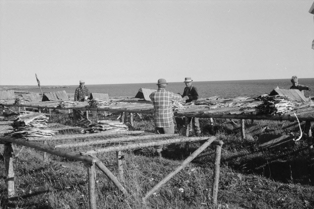 - Scène : séchoir : morue, homme, bord de mer, Atlantique, Saint-Laurent