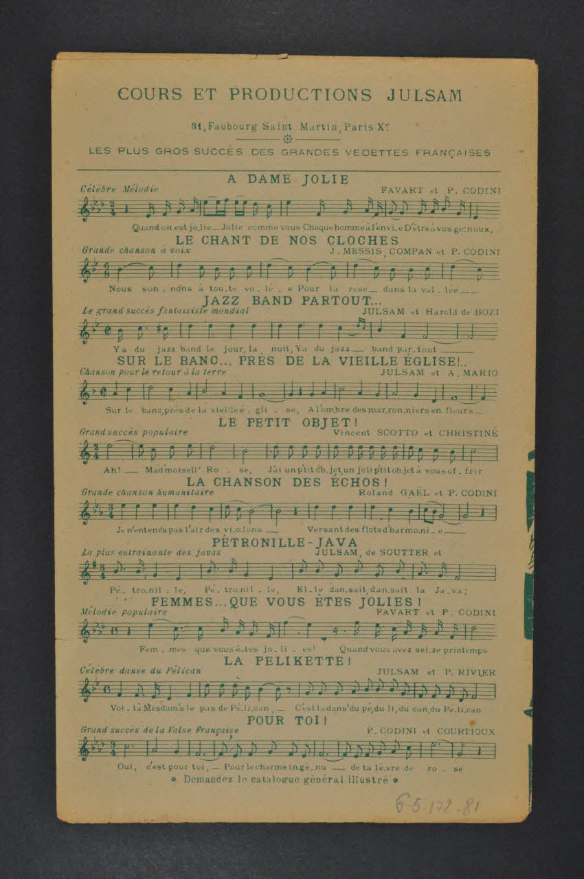 Des inscriptions renseignent le titre, les auteurs, les exécutants et l'éditeur. A l'intérieur, partition et paroles de la chanson. Au dos, liste d'autres partitions publiées par l'éditeur.Décor