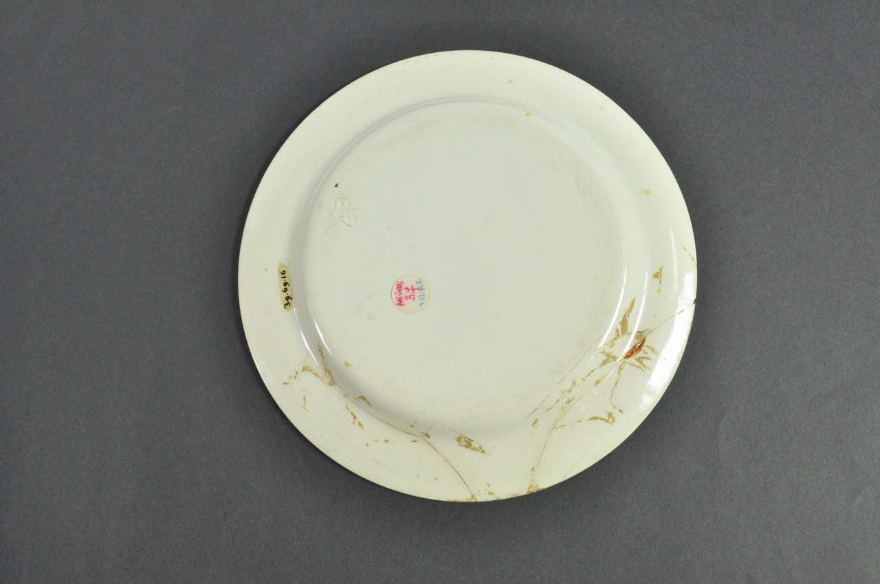 Faïence fine moulée, poinçonnée au verso, à glaçure transparente et à décor imprimé / En faïence fine moulée, sur plan circulaire, à bords bas, émaillée blanc et présentant un décor noir imprimé : une ligne de festons avec de petits cercles souligne le marli, ce dernier est couvert de fleurs et de feuillages ; au fond est figurée une scène paysanne : une femme assise file avec une quenouille, avec à sa gauche, un jeune homme assis, et à sa droite, une jeune fille debout.Inscriptions