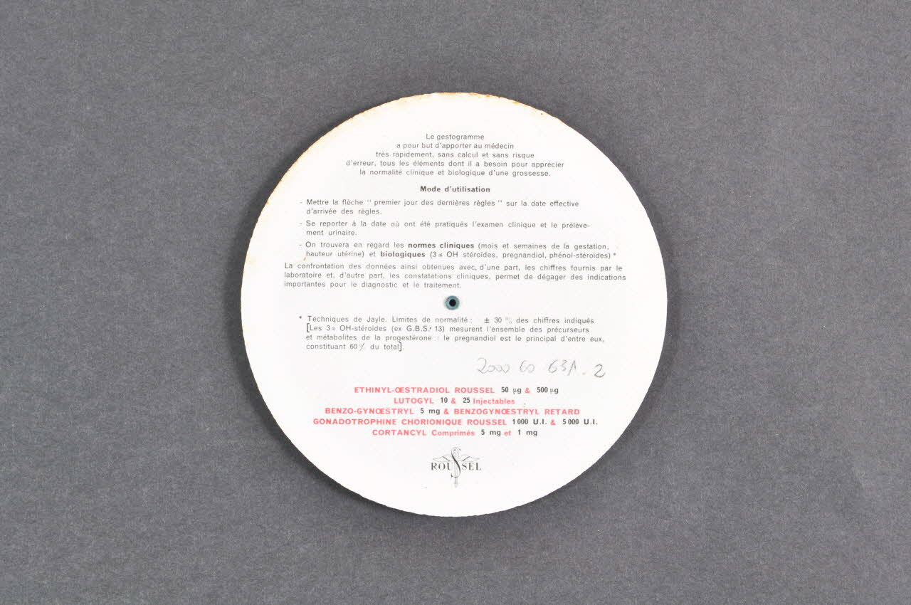 Cet objet a pour fonction d'être un gestogramme destiné à apprécier l'état de la grossesse. Il se compose de deux disques le plus grand comporte les mois de l'année et le plus petit le normagramme circulatoire de la gestation. Les deux sont reliés par un élément métallique. Au dos figure des notes explicatives quant au mode d'utilisation.Matériaux et techniques