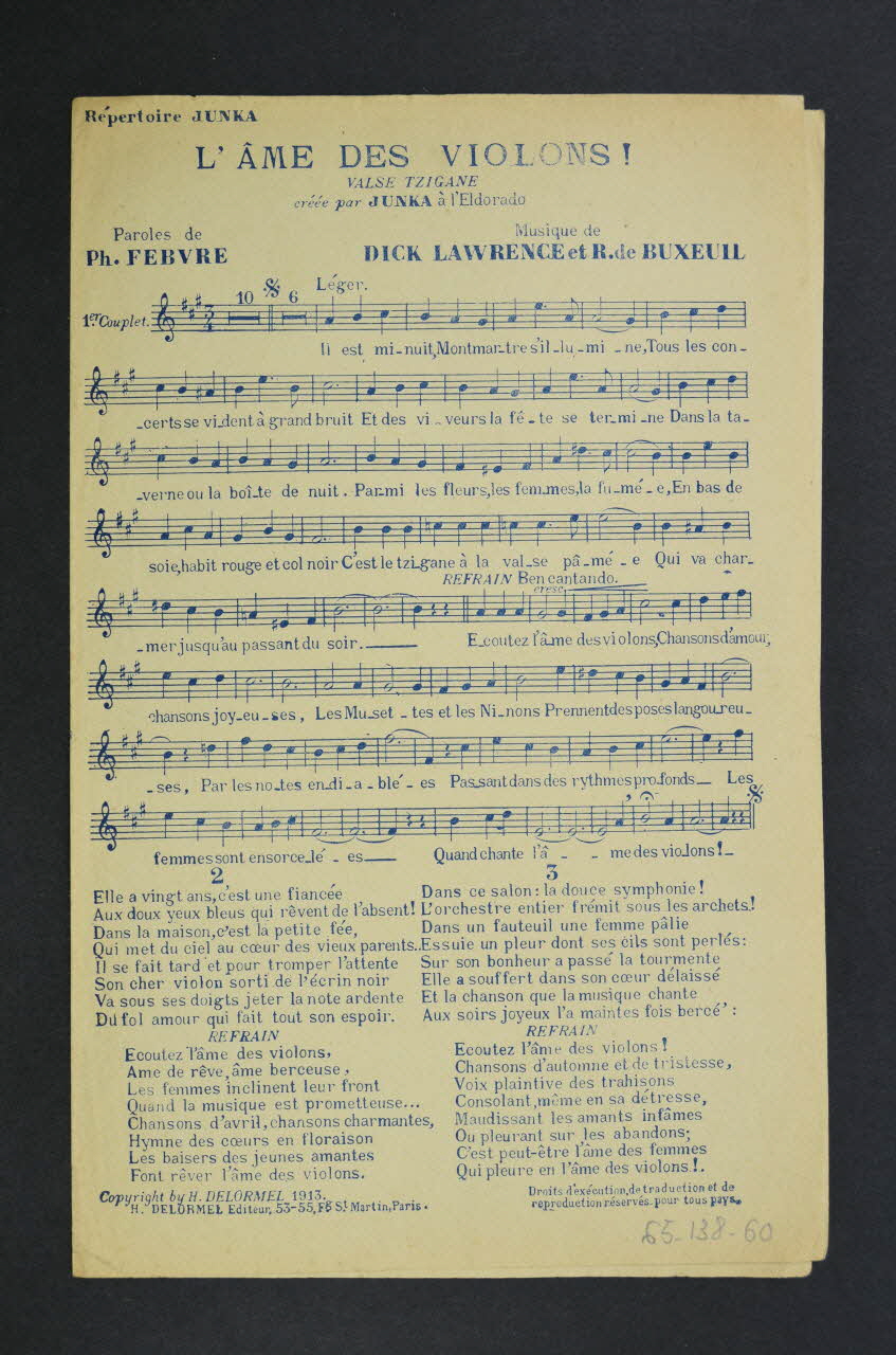 Les inscriptions renseignent le titre de la chanson, le nom des auteurs, de l'artiste et de l'éditeur. L'intérieur est laissé vierge. Au dos, la partition et les paroles.Décor