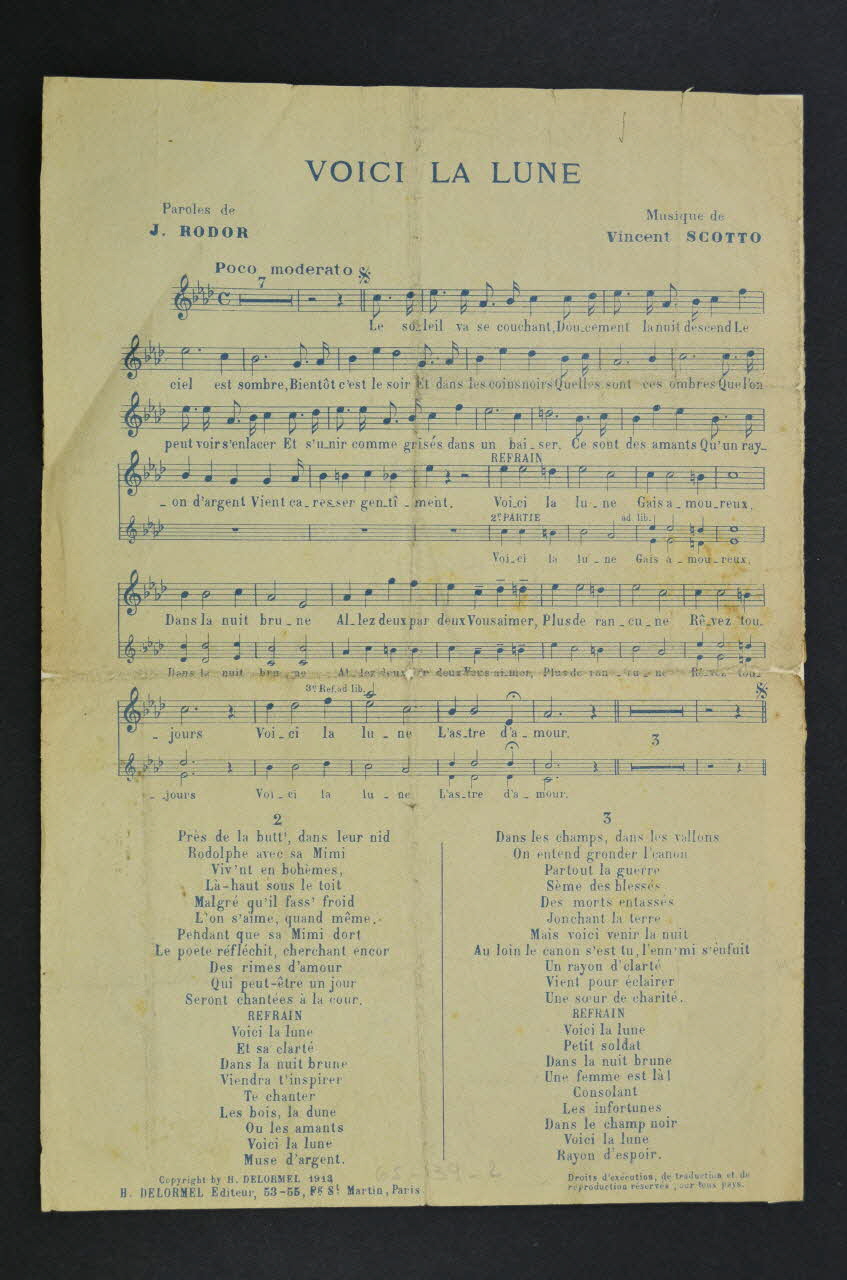 Les inscriptions renseignent le titre de la chanson, le nom des auteurs, de l'artiste et de l'éditeur. L'intérieur est laissé vierge. Au dos, la partition et les paroles. Des bandes adhésives renforcent les déchirures.Décor